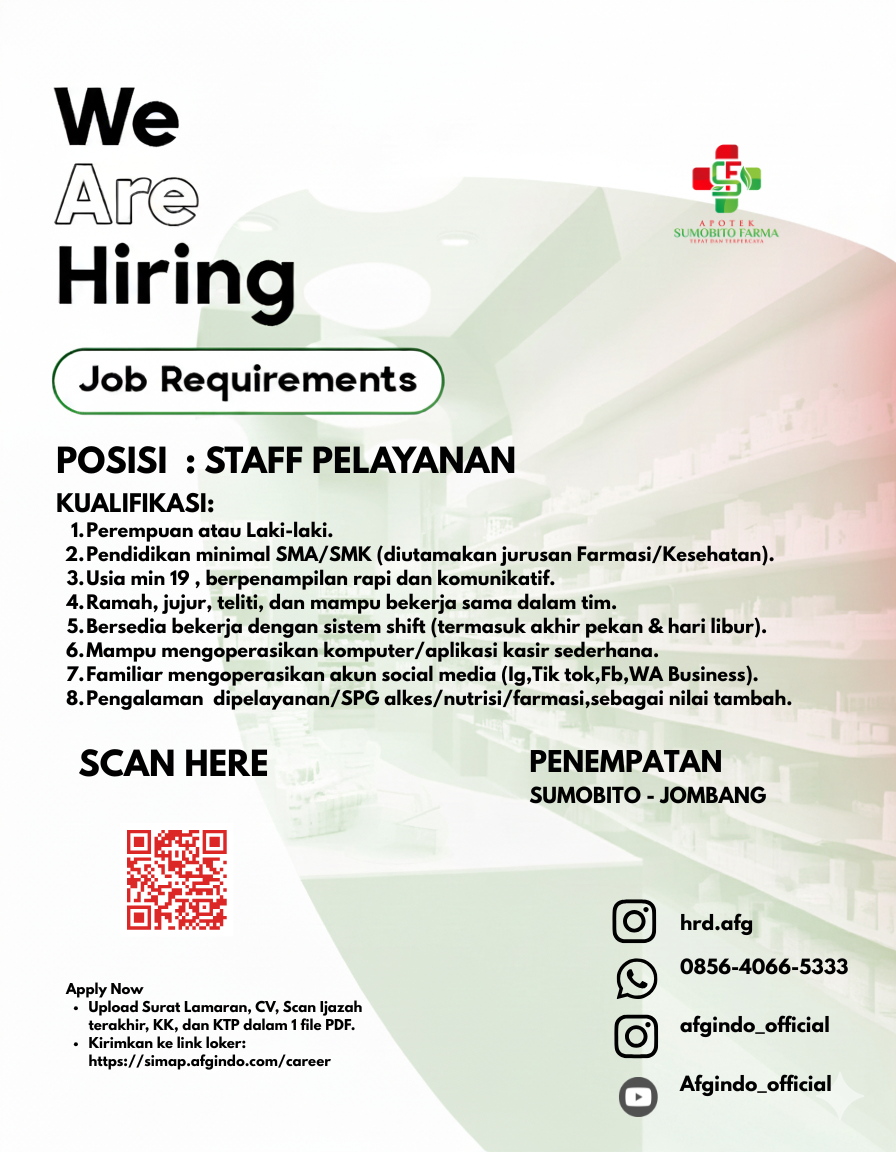 - Pendidikan minimal SMA/SMK (diutamakan jurusan Farmasi/Kesehatan).
