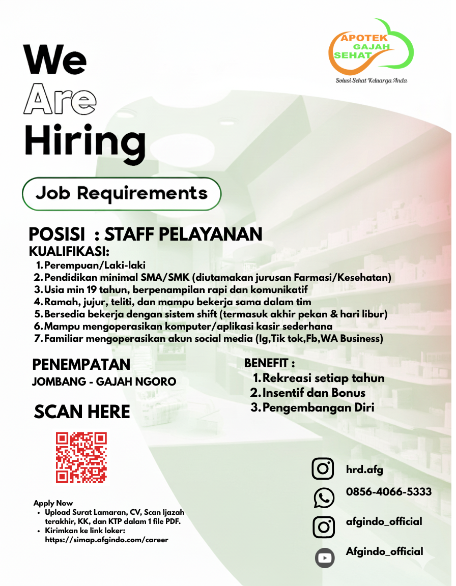 - Pendidikan minimal SMA/SMK (diutamakan jurusan Farmasi/Kesehatan), D3 Farmasi.